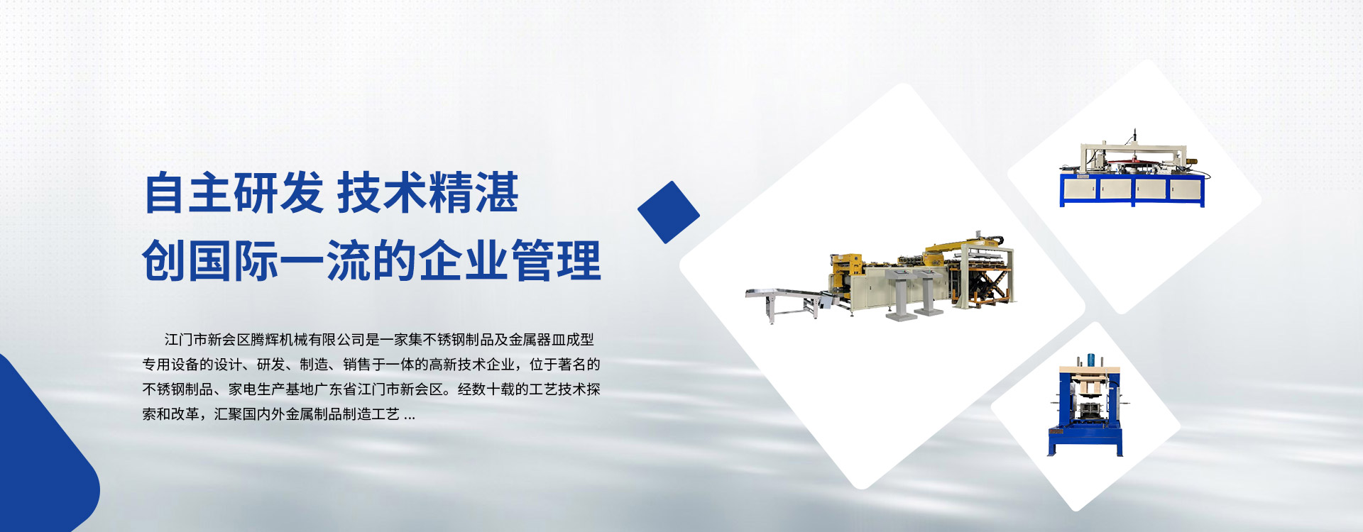 江門市新會(huì)區(qū)騰輝機(jī)械有限公司是一家集不銹鋼制品及金屬器皿成型專用設(shè)備的設(shè)計(jì)、研發(fā)、制造、銷售于一體的高新技術(shù)企業(yè),位于著名的不銹鋼制品、家電生產(chǎn)基地廣東省江門市新會(huì)區(qū)。經(jīng)數(shù)十載的工藝技術(shù)探索和改革,匯聚國(guó)內(nèi)外金屬制品制造工藝。